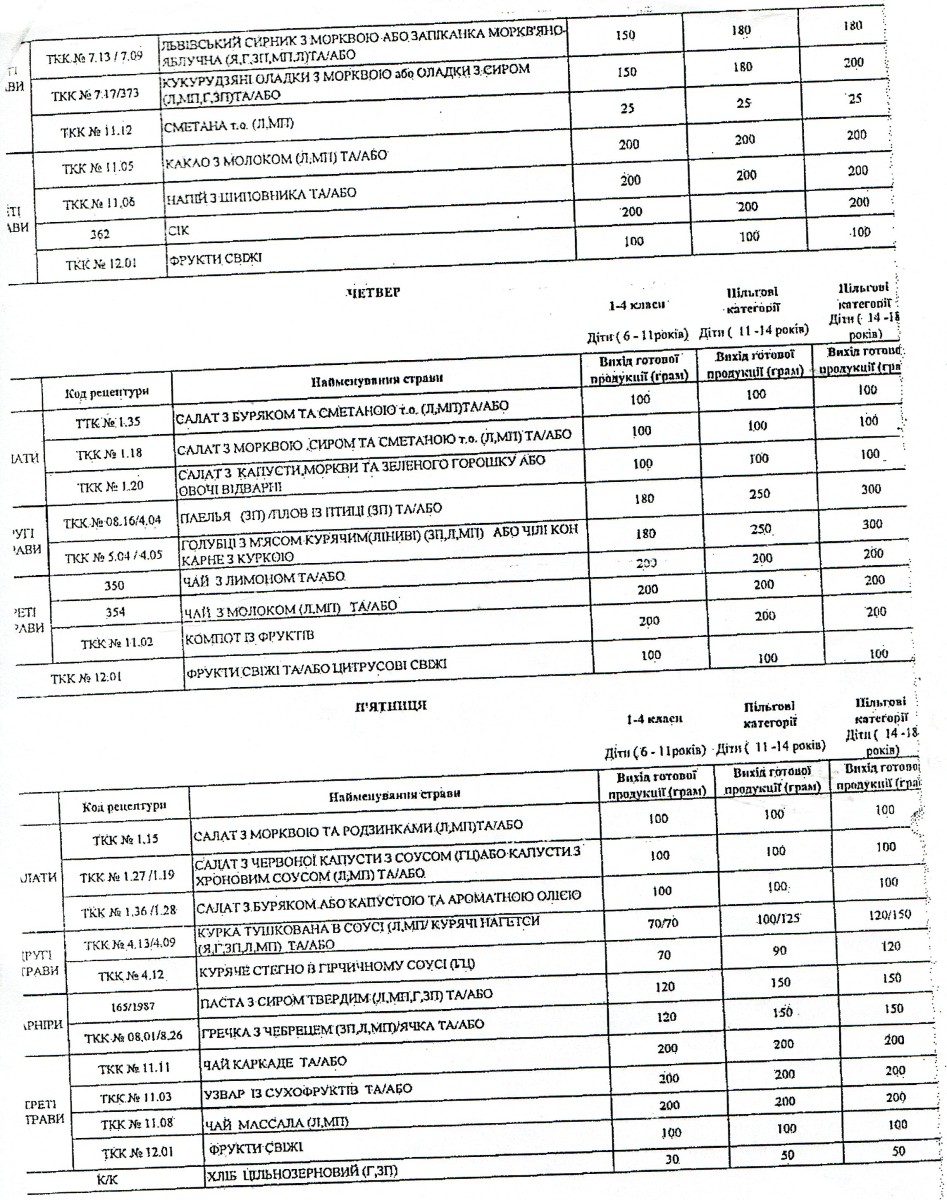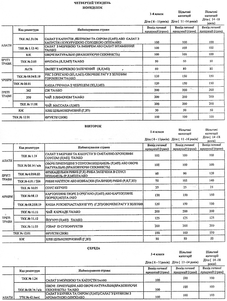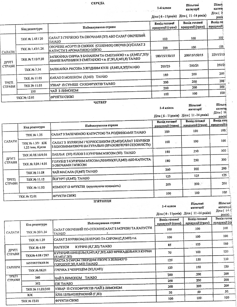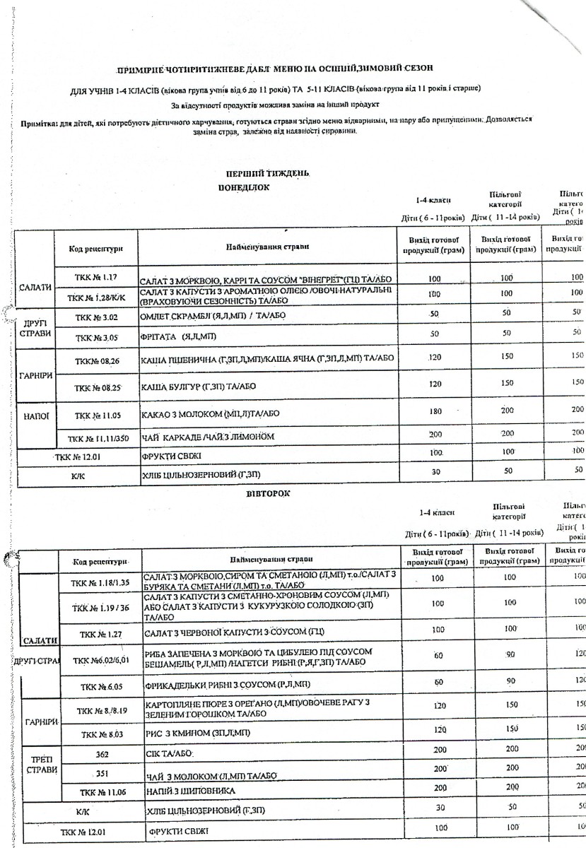 Примірне чотиритижневе сезонне дабл меню на осінній, зимовий сезони для організації одноразового харчування учнів 1-4 класів та 5-11 класів загальноосвітніх навчальних закладів Солом’янського району м. Києва