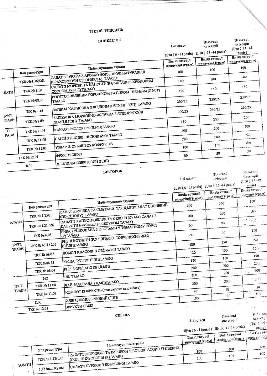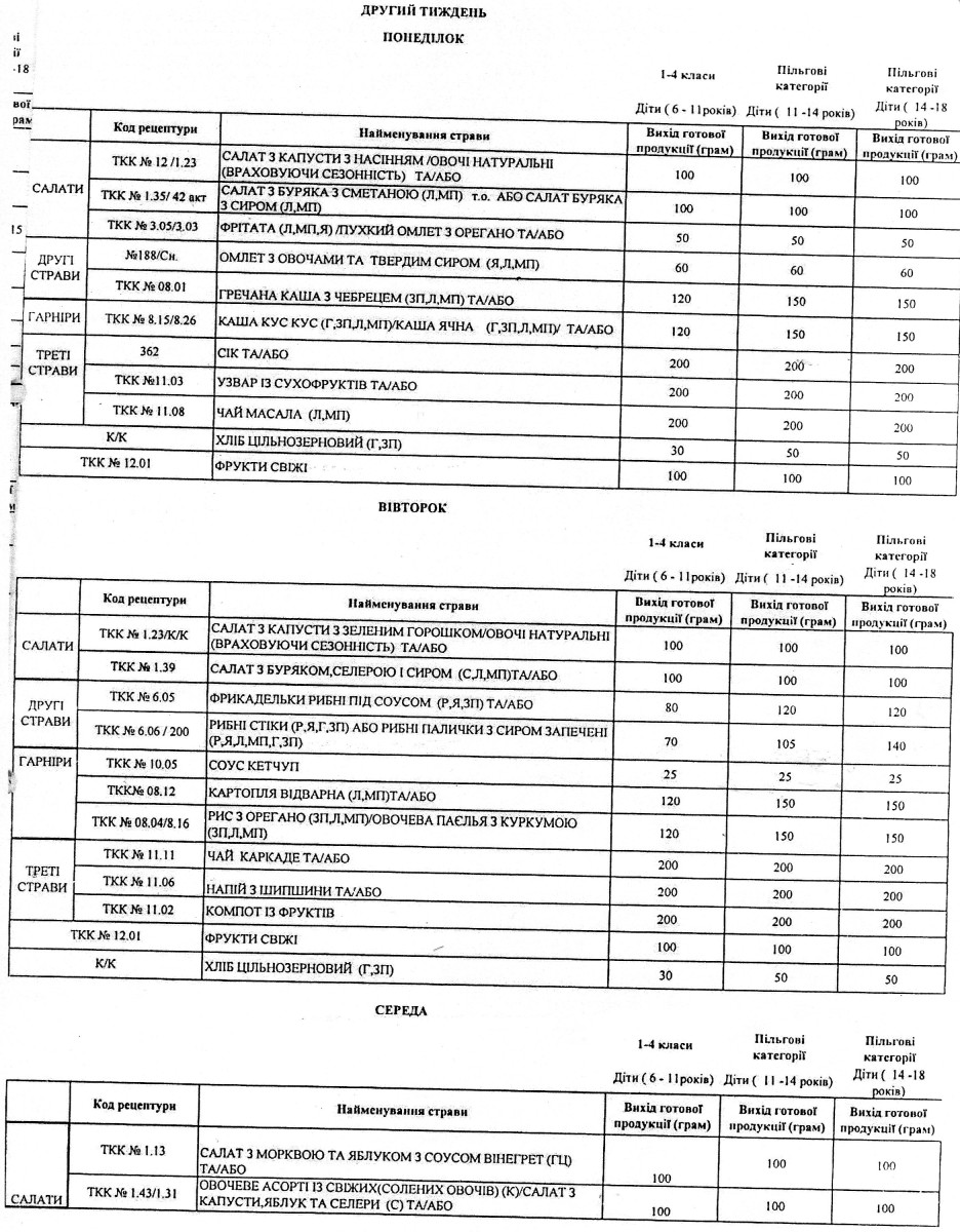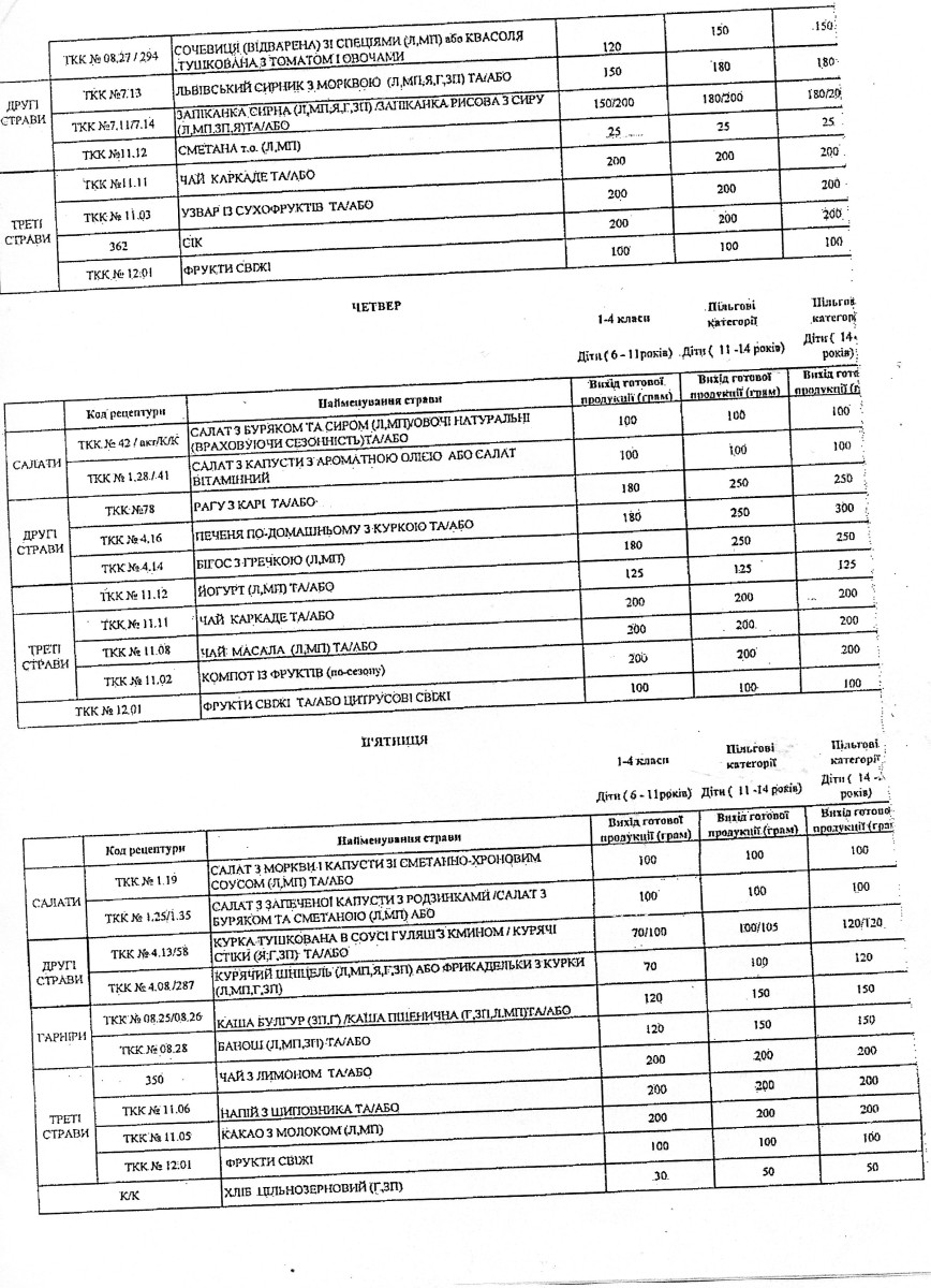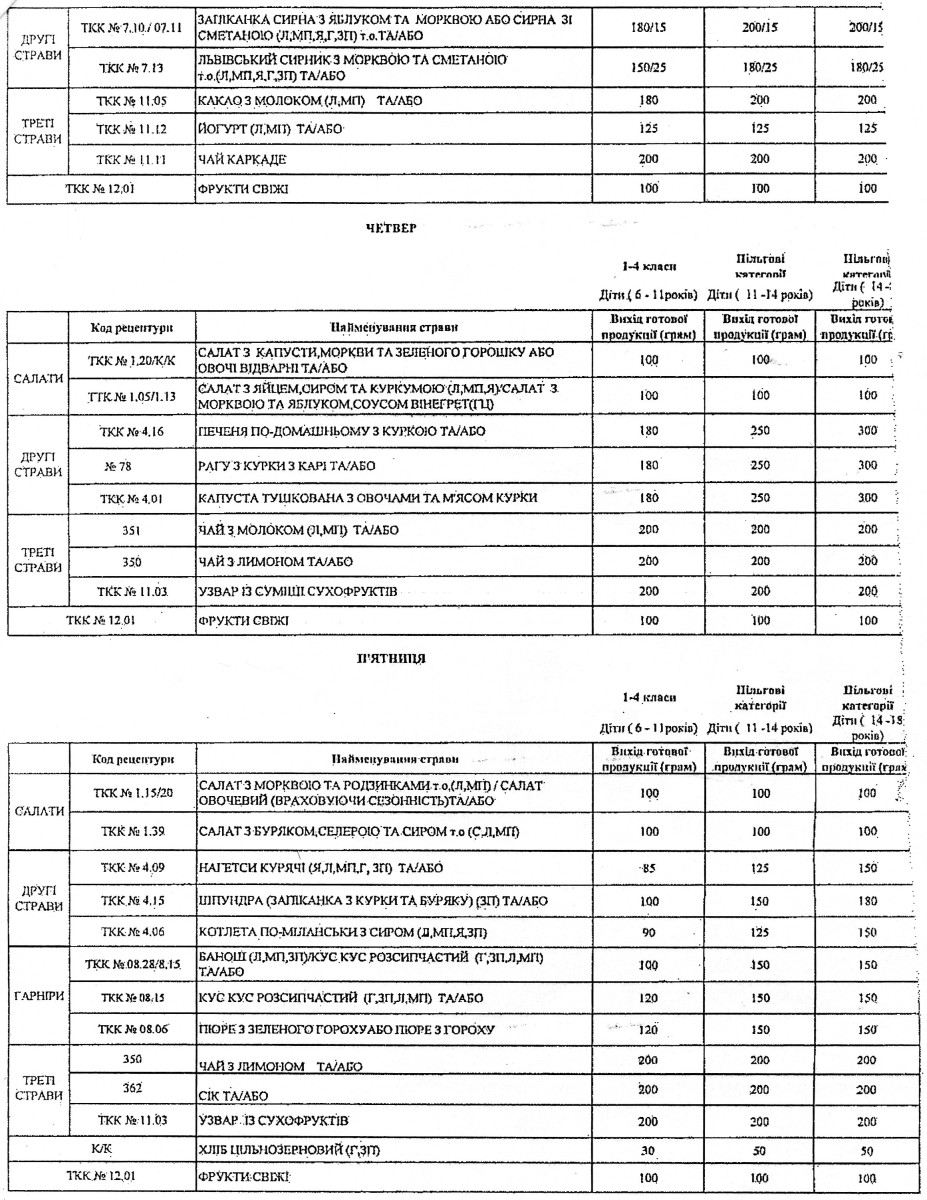 Примірне чотиритижневе сезонне дабл меню на осінній, зимовий сезони для організації одноразового харчування учнів 1-4 класів та 5-11 класів загальноосвітніх навчальних закладів Солом’янського району м. Києва
