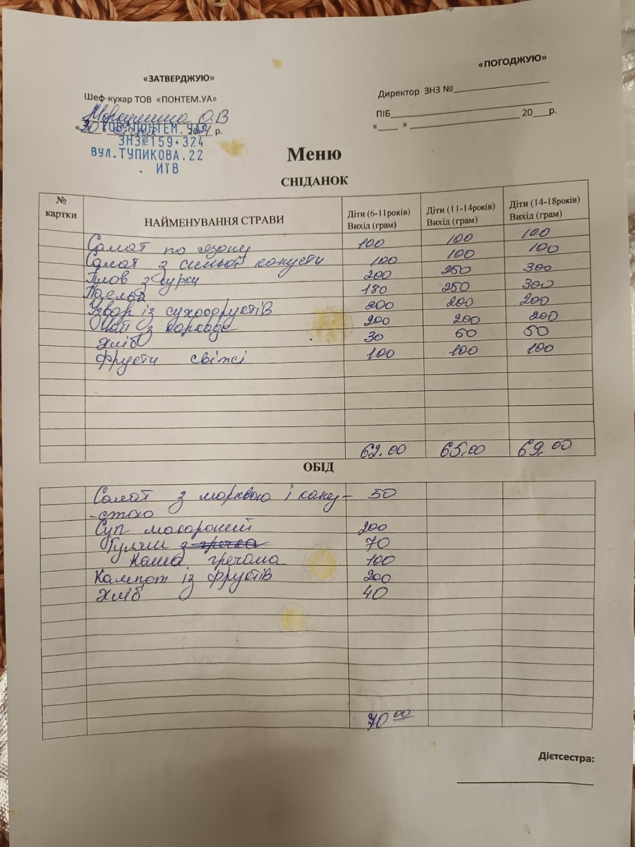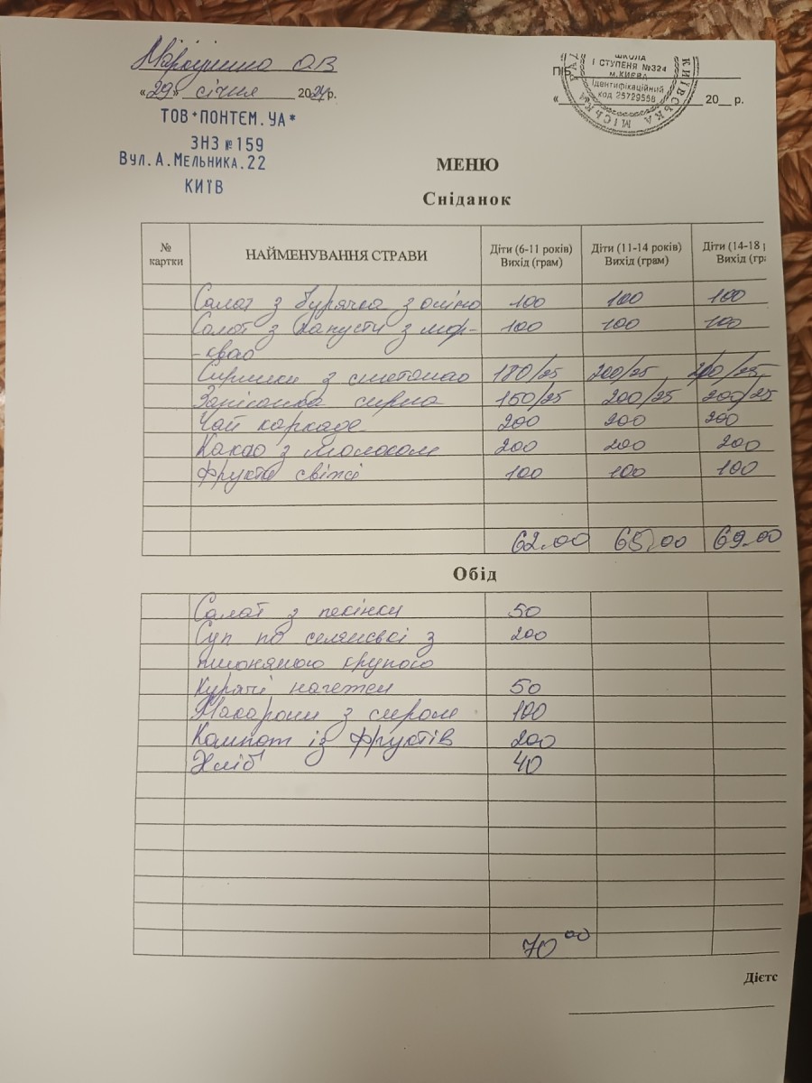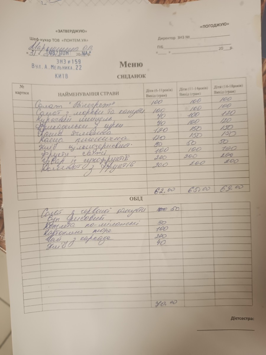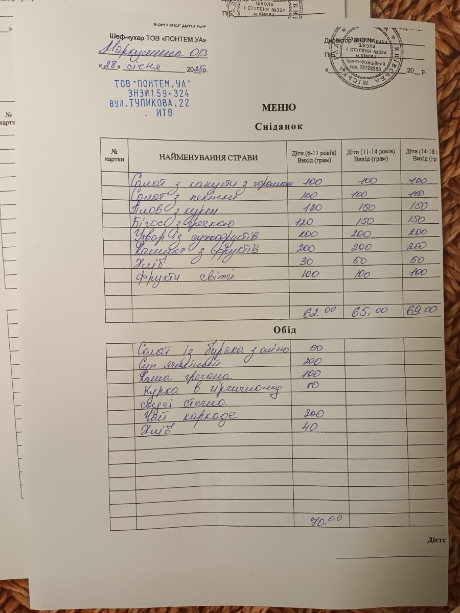 Примірне чотиритижневе сезонне дабл меню на осінній, зимовий сезони для організації одноразового харчування учнів 1-4 класів та 5-11 класів загальноосвітніх навчальних закладів Солом’янського району м. Києва